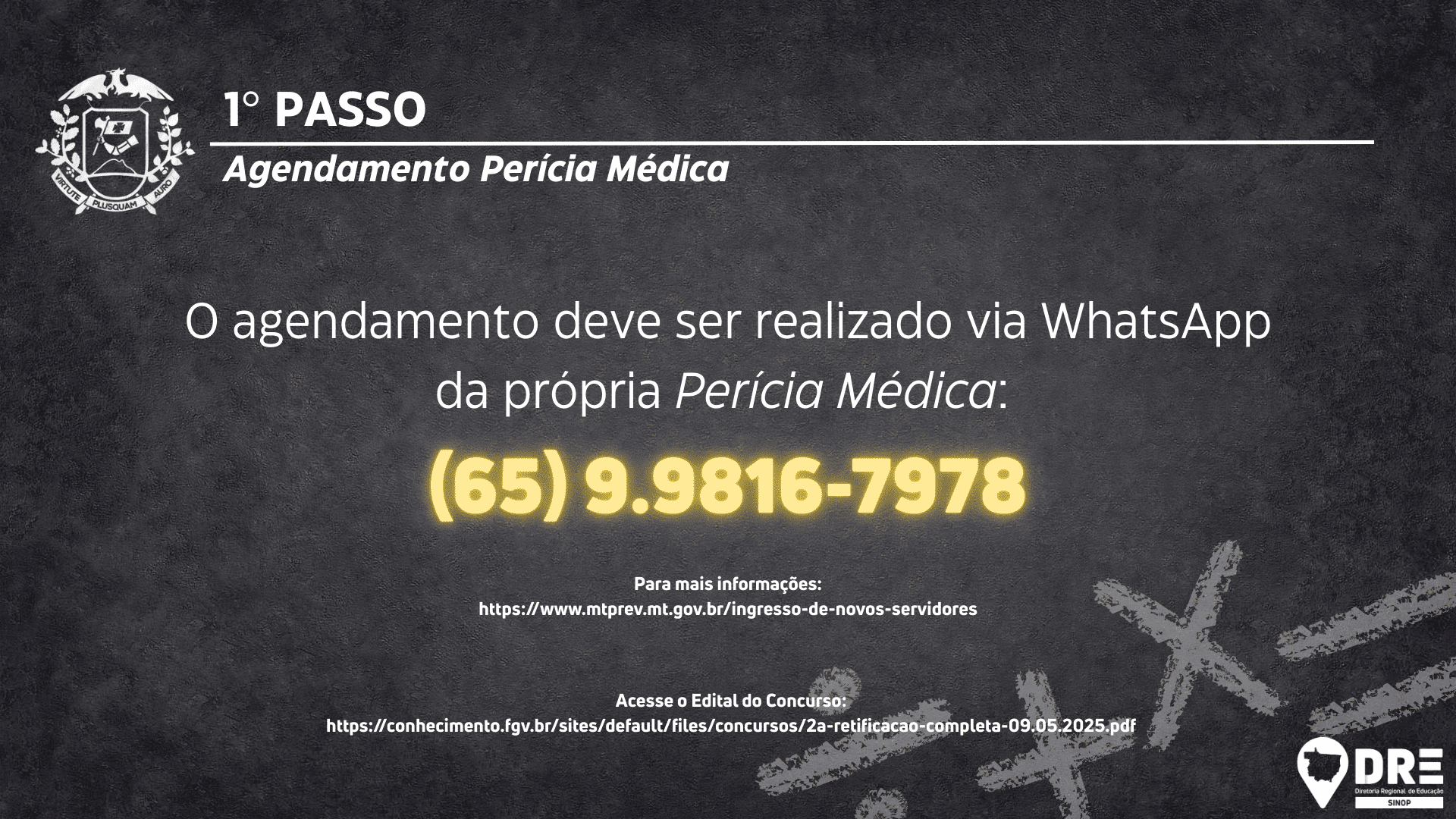 1º Passo – Agendamento de Perícia Médica via Whatsapp (65) 9 9816-7978 (Informações: https://www.mtprev.mt.gov.br/ingresso-de-novos-servidores);