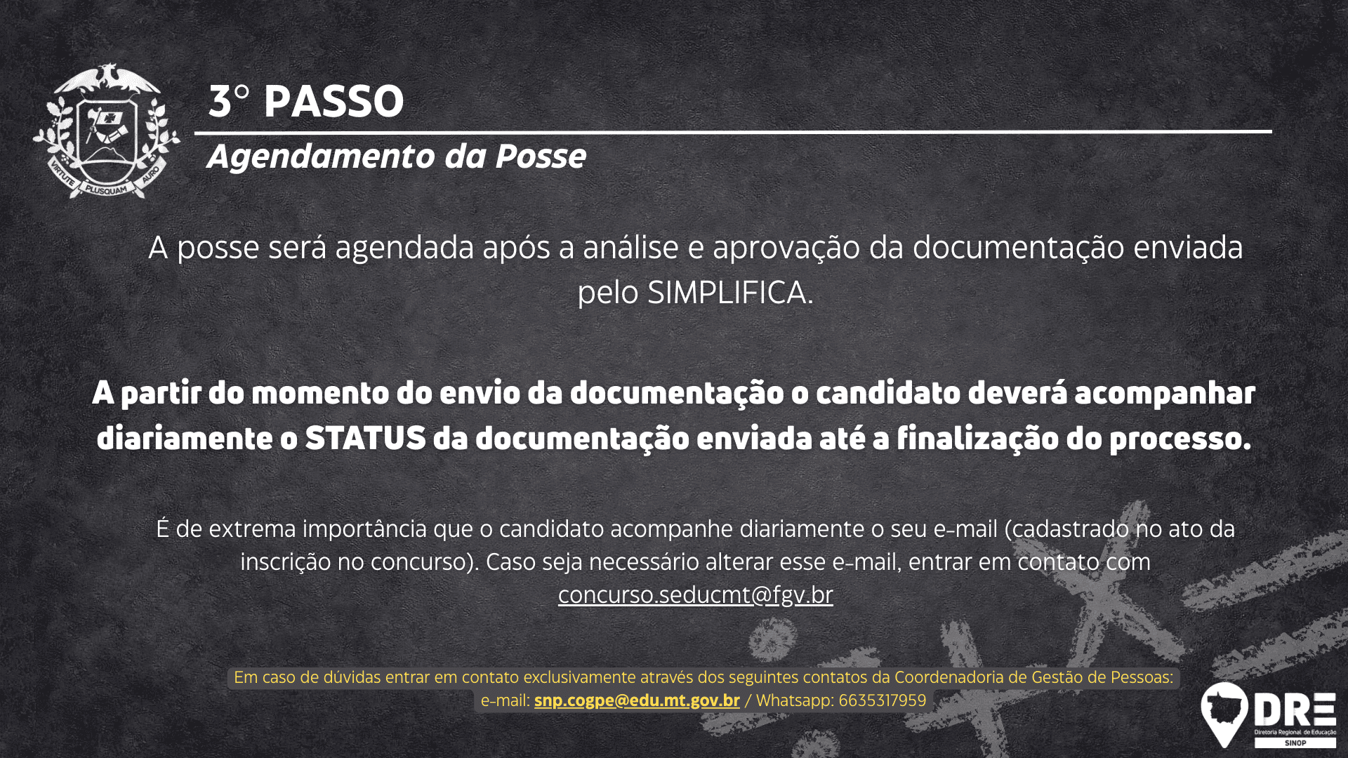 - É de extrema importância que o candidato acompanhe diariamente o seu e-mail (cadastrado no ato da inscrição no concurso). Caso seja necessário alterar esse e-mail, entrar em contato com concurso.seducmt@fgv.br