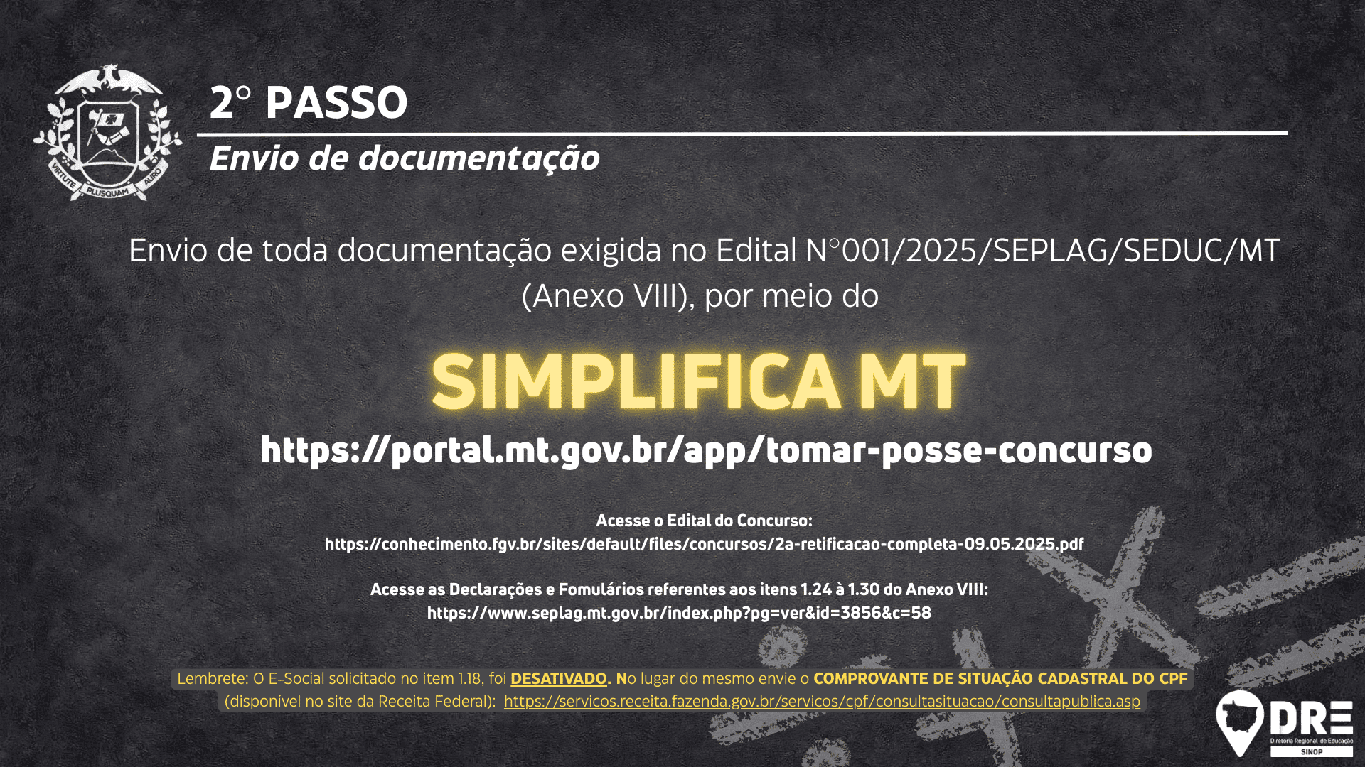 2º Passo – Envio de toda a documentação exigida no Edital nº 001/2025-SEPLAG/SEDUC/MT – Anexo VIII por meio do SIMPLIFICA MT (https://portal.mt.gov.br/app/tomar-posse-concurso);